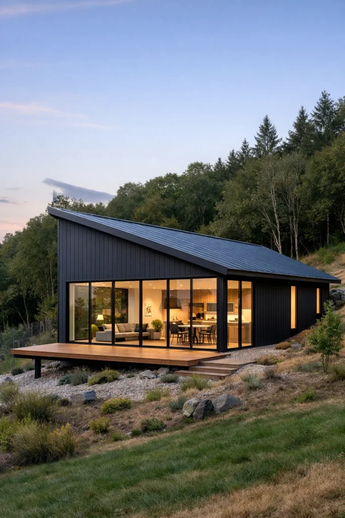 - The Minimalist Mono-Pitch: Instead of the classic gable, this design uses a single, sleek, sloped roof. Its clean lines and wall-to-wall glass on the downhill side provide maximum light and a hyper-modern aesthetic, making it an ideal small barn house plan for a narrow or sloped plot.