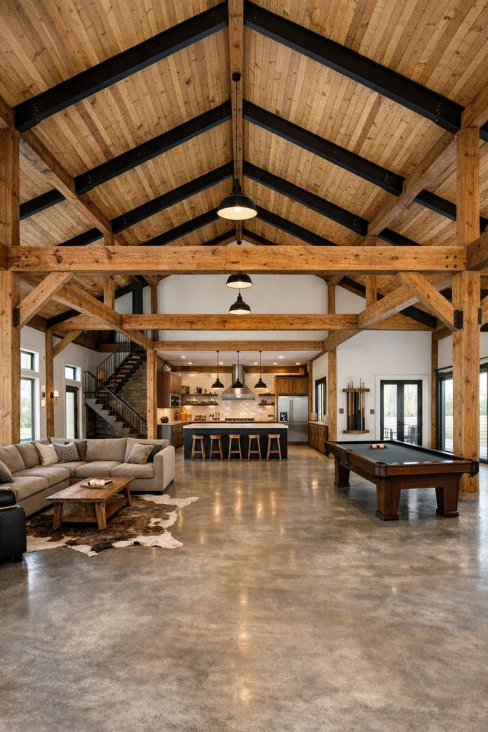 - The Luxury Timber Frame: This premium approach to the barn house plan uses massive, exposed wooden beams and trusses as the primary structural and aesthetic element. The craftsmanship of the heavy timber is left fully visible, creating an interior that feels custom, warm, and utterly breathtaking.