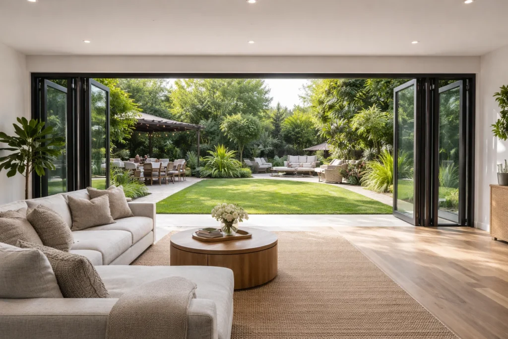 Forget traditional walls. By using floor-to-ceiling bifold glass doors on the primary living side of your home, you effectively eliminate the visual boundary between your sofa and your garden. When you open those doors, your living room doubles in size instantly.