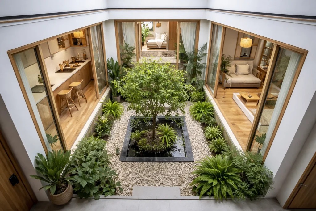 If you have a narrow lot, build your house in an “O” shape around a tiny central courtyard (even just 4×4 feet). This ensures that every single room has access to natural light and fresh air from two sides, making the small house design feel airy and connected to nature.