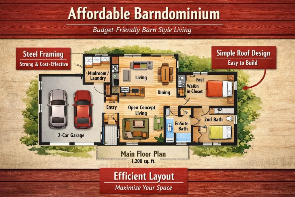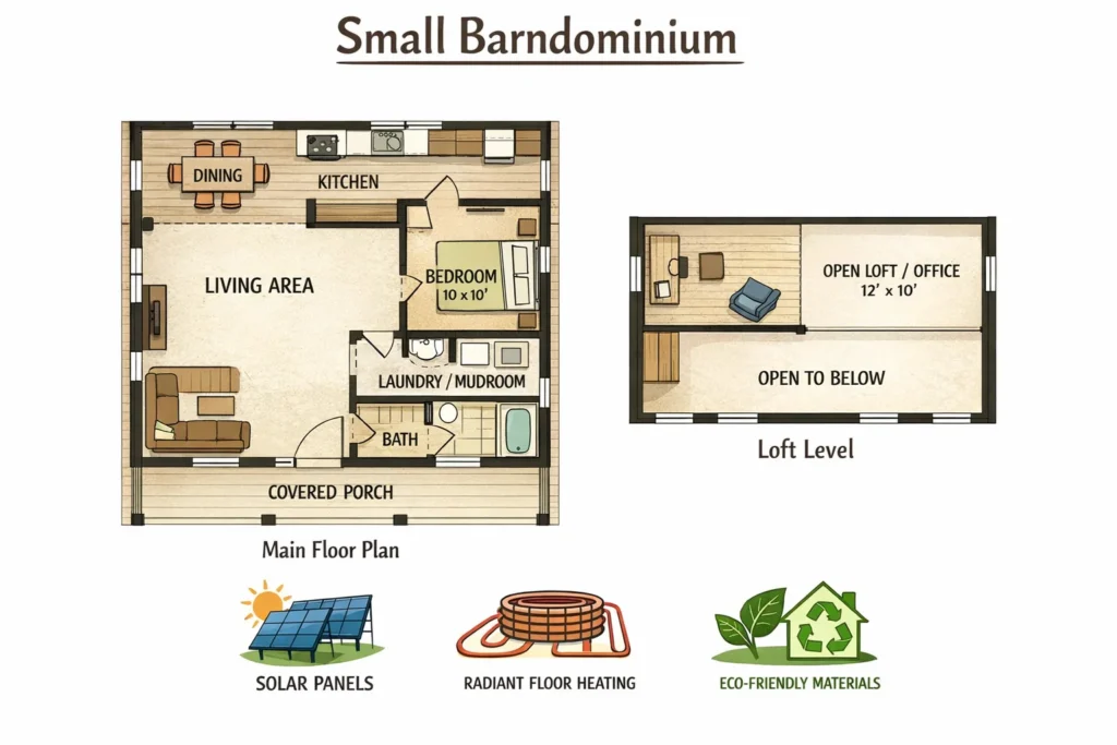 Depending on materials and location, most tiny barndominium floor plans cost $80–$140 per sq. ft. to build far less than conventional homes.