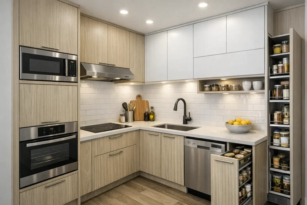 Streamlined layouts maximize every square foot. Compact kitchens integrate storage-smart cabinetry and modern appliances for functionality without clutter.