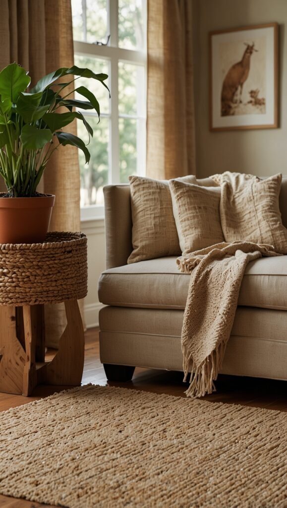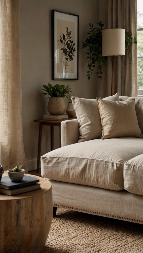 The fastest way to achieve the look is through textiles and greenery. Replace your current throw pillows with linen or wool covers in earth tones, add a large indoor tree like an Olive or Fiddle Leaf Fig, and swap out “shiny” decor for matte, hand-crafted ceramics.