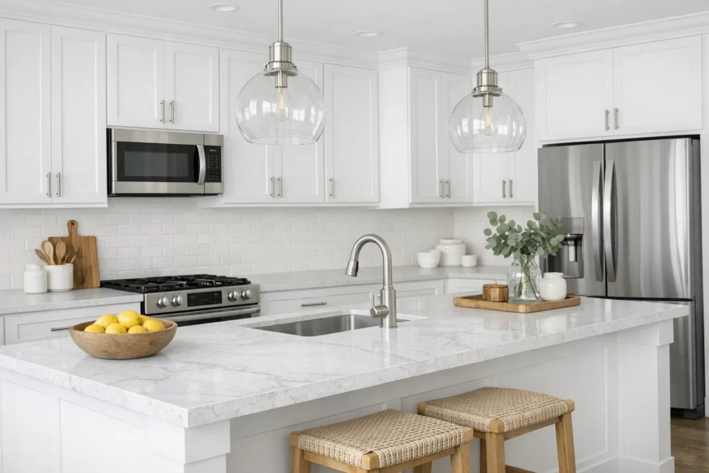 - Light Quartz: A highly durable, engineered option that provides a consistent look, often in soft whites or pale grays, for lower maintenance.